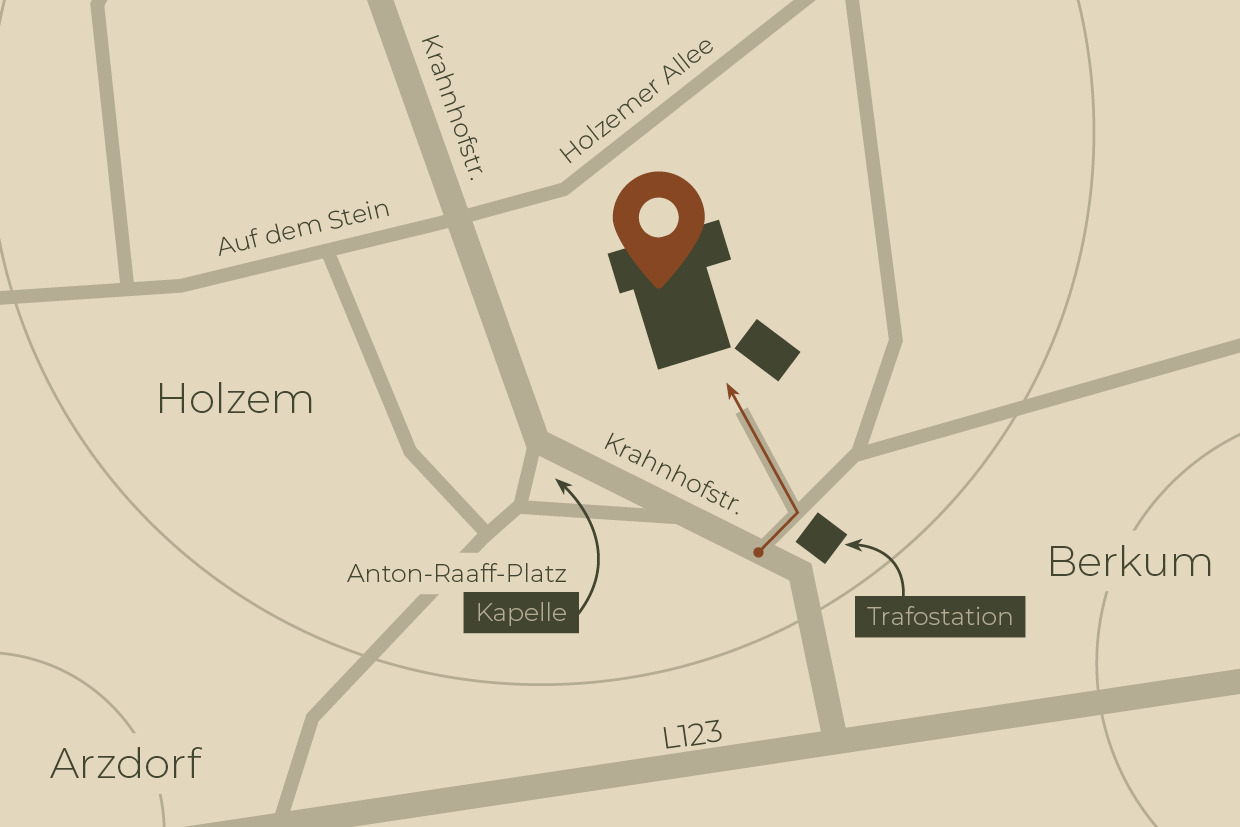 Aus Richtung Arzdorf oder Berkum: Folge der L123, biege auf die Krahnhofstraße ab und nimm dann die erste Straße rechts.